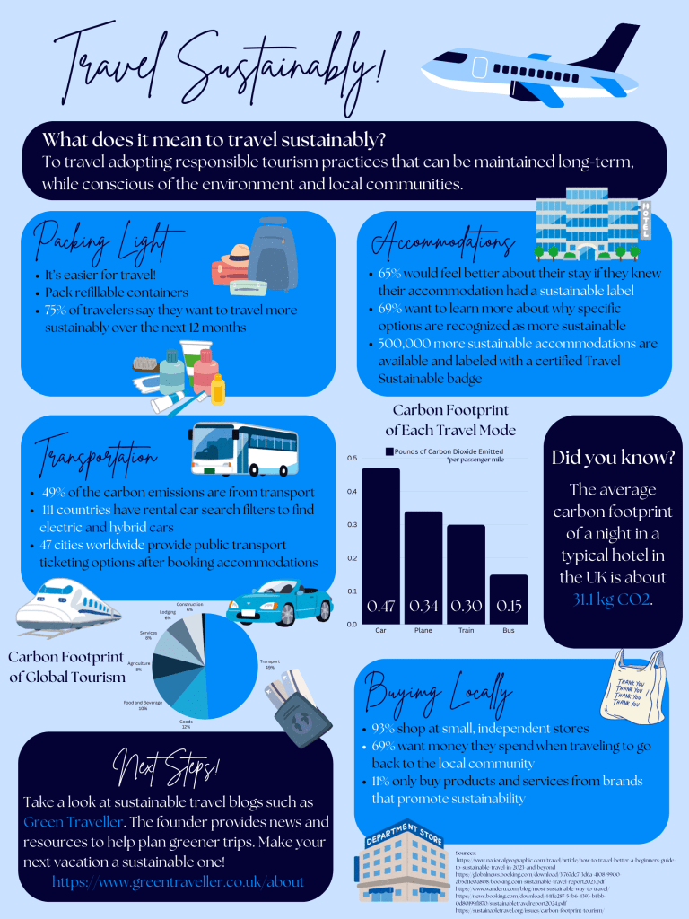 I created an infographic about why travelers should make sustainable travel decisions and the effects of our carbon footprint. I used Canva to create the infographic and data charts.