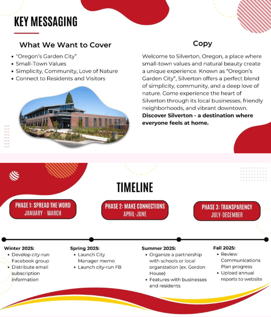 My team and I have developed a new communications plan for the City of Silverton. After our site visit to learn more about the community, we’ve come up with strategies to achieve our three goals through objectives and tactics. We were also encouraged to be sustainable and develop long term recommendations for the client. We presented these ideas to the team at the end of the term.